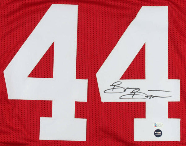 Custom on-field style jersey. Everything is sewn on, size XL. Hand-signed by Brian Bosworth.The lot / autograph(s) includes an official Prova hologram and matching COA as well as an official Beckett Authentication Services serially-numbered hologram and matching COA for authenticity purposes. Item was signed in the presence of a Prova representative and was witnessed by Beckett.Authentication: Prova COA & Beckett COA