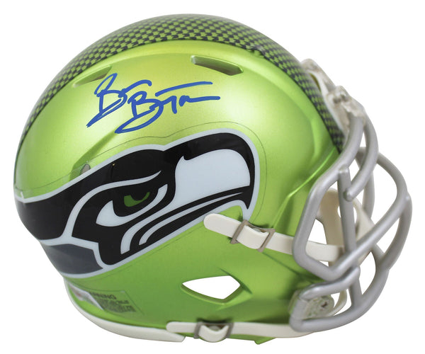 This Autographed Alternate Flash Speed Mini Helmet has been Personally Signed by Brian Bosworth of the Seattle Seahawks. This item is 100% Authentic to include a hologram by Beckett Authentication Services. This item will come with the new Beckett Authentication hologram that has a scannable QR code rather than the traditional COA. If you would like to have a COA, you are welcome to reach out to Beckett for a printed certification once you receive your item. This is a BAS Witnessed Protection Program item which means a Beckett Authentication Service representative was present when this item was being signed. We conducted an autograph signing with Brian Bosworth where multiples of the same item were signed. While the photographs are representative of this item, the size, placement and strength of the signature may vary. Each item is hand signed, therefore, each autograph is unique. This item can be verified through BAS Witnessed.