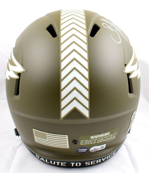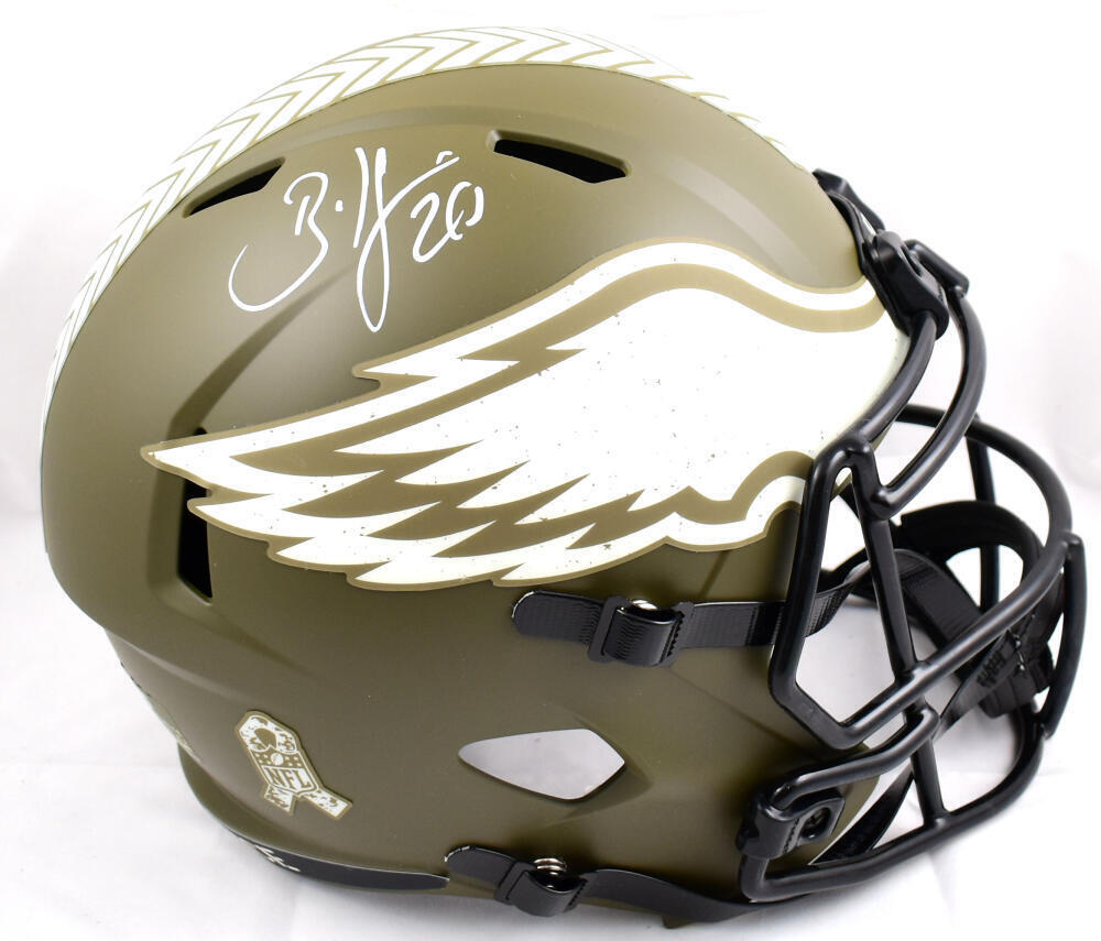 Brian Dawkins Autographed Eagles F/S Salute to Service Speed Helmet-Beckett W Hologram *White This is a Brian Dawkins of the Philadelphia Eagles hand autographed Riddell Full Size Salute to Service Speed Replica Helmet. This item has a Beckett Witnessed Authentication, which comes with a numbered hologram and a QR code for verification. You can view this item on the Beckett authentication website, it shows when and where the item was signed. It was signed either at a public autograph appearance or a private signing. This is a stock photo of the item. Although you may not receive this exact item, the item you receive is virtually identical, brand new, and in great shape.