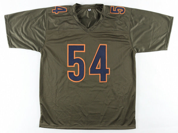 Custom on-field style jersey. Everything is sewn on, size XL. Hand-signed in black felt-tip pen by Brian Urlacher (HOF). Urlacher's career highlights have been custom stitched onto the back of the jersey below the reverse numbers. The lot / autograph(s) includes an official Beckett Authentication Services serially numbered hologram for authenticity purposes. The signing of this item was witnessed by BeckettAuthentication: Beckett Hologram