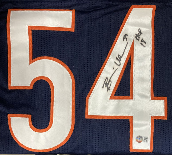 Featured is a Brian Urlacher signed custom football jersey, inscribed "HOF 18". This jersey was hand signed by Urlacher and comes with the Beckett hologram and certificate of authenticity. This jersey features professionally sewn letters and numbers and is size XL.This is a custom jersey and not to be associated with any league or it's teams. This is intended to be an autographed collectible.. SPECIFICATIONS Autographed By: Brian Urlacher Team: Chicago Bears Sport: Football Authentication: Beckett Grading Services
