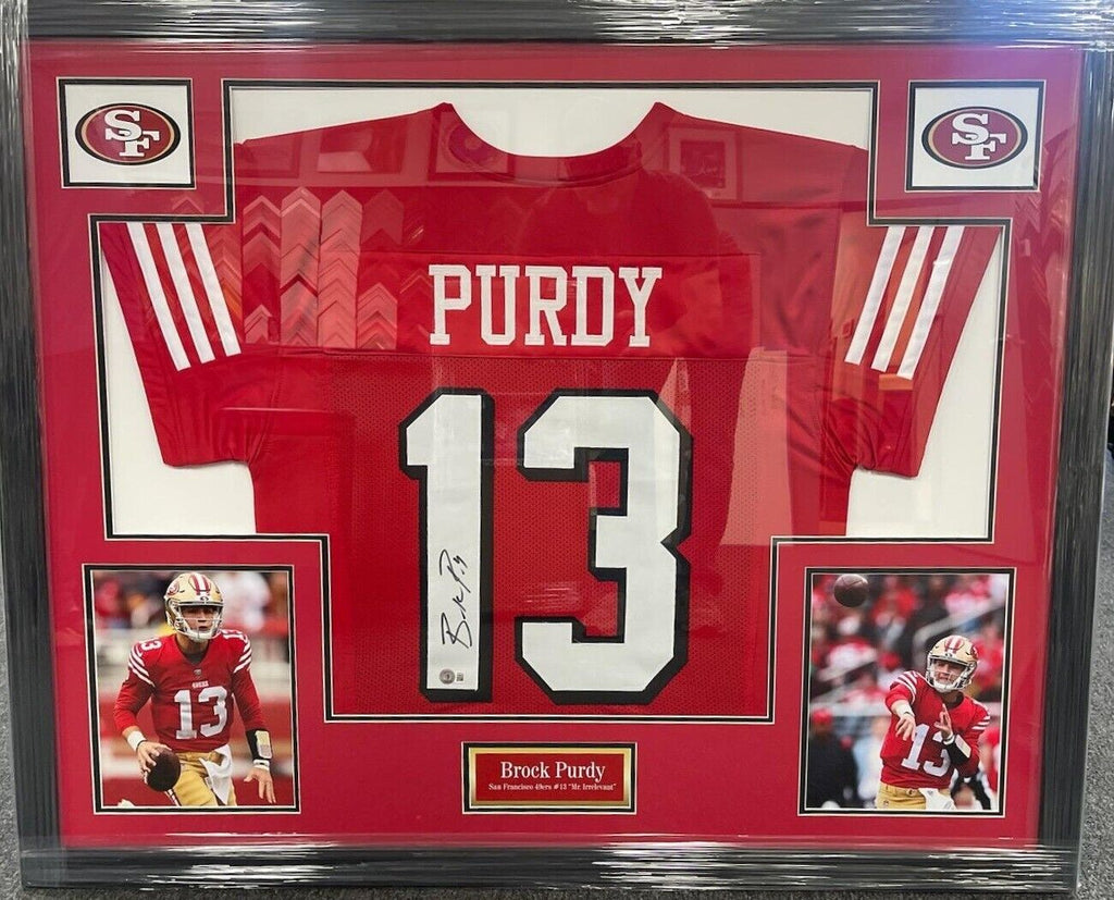This Autographed Red Shadow Pro Style Framed Jersey has been Personally Signed by Brock Purdy of the San Francisco 49ers. This item is 100% Authentic to include a hologram by Beckett Authentication Services. This item may come with the new Beckett Authentication hologram that has a scannable QR code rather than the traditional COA. If you would like to have a COA, you are welcome to reach out to Beckett for a printed certification once you receive your item. This is a BAS Witnessed Protection Program item which means a Beckett Authentication Service representative was present when this item was being signed. We conducted an autograph signing with Brock Purdy where multiples of the same item were signed. While the photographs are representative of this item, the size, placement and strength of the signature may vary. Each item is hand signed, therefore, each autograph is unique. This item can be verified through BAS Witnessed. This item has been professionally framed to overall dimensions of approximately 35 x 43 inches.