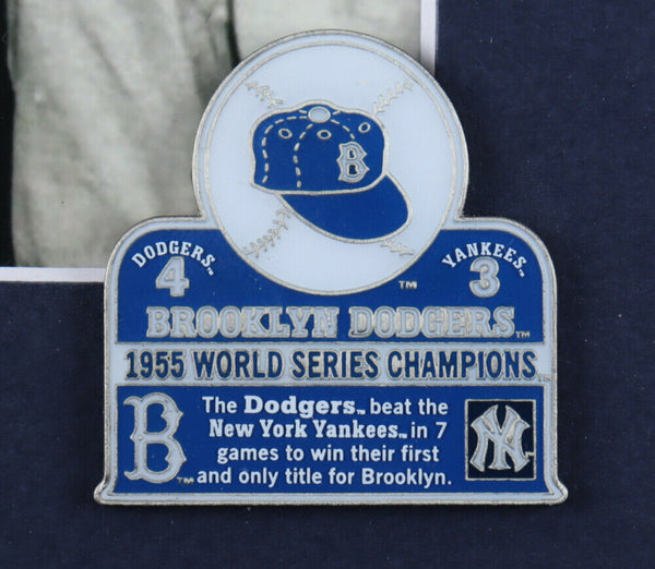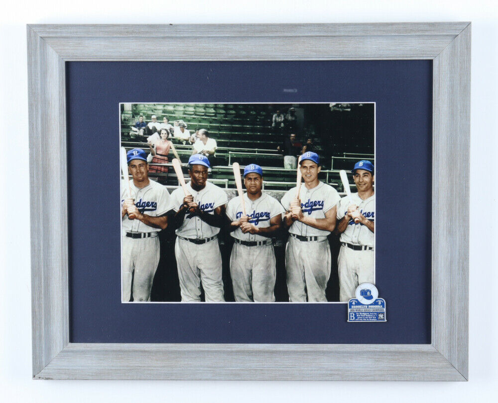 Custom Unsigned framed display measures 13" x 16" and features a Brooklyn Dodgers photo of Duke Snider (D.2011, HOF), Jackie Robinson (D.1972, HOF), Roy Campanella (D.1993, HOF), Carl Furillo (D.1989), and Gil Hodges (D.1972, HOF). Display also features a 1955 Dodgers World Series pin.