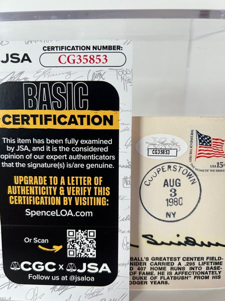 Legendary Duke Snider Cooperstown Collectible Add a crown jewel to your collection with this exceptional Duke Snider autographed Cooperstown cachet envelope, professionally authenticated by JSA. This rare piece celebrates "The Duke of Flatbush," one of baseball's most beloved Hall of Fame center fielders and Brooklyn Dodgers icon. Premium Collectible Features: Authentic Signature: Hand-signed by Duke Snider himself Cooperstown Cachet: Official Hall of Fame commemorative envelope JSA Authentication: Includes Certificate of Authenticity for guaranteed authenticity Brooklyn Dodgers Legend: Celebrates one of the most iconic players in franchise history Investment Quality: Museum-grade collectible with verified provenance Duke Snider, known as "The Silver Fox" and "The Duke of Flatbush," was the heart of the legendary Brooklyn Dodgers teams of the 1950s. A seven-time All-Star and Hall of Fame inductee, Snider was part of the famous center field trio alongside Willie Mays and Mickey Mantle. His powerful swing and graceful fielding made him a fan favorite at Ebbets Field. This signed cachet envelope captures the essence of baseball's golden era and makes an extraordinary addition to any serious sports memorabilia collection.
