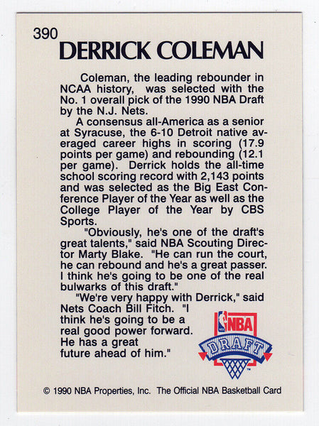 Derrick Coleman signed Nets 1990 Hoops rookie basketball trading card #390. Item comes with a Schwartz Sports Memorabilia tamper-proof numbered hologram and Certificate of Authenticity which can be verified online.