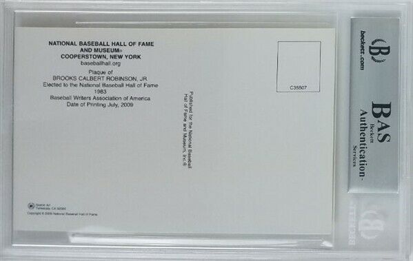 This autographed HOF plaque card has been personally hand-signed by Brooks Robinson of the Baltimore Orioles.This autograph is certified by BAS (Beckett Authentication Services). It comes encapsulated and authenticated by Beckett in the plastic case.