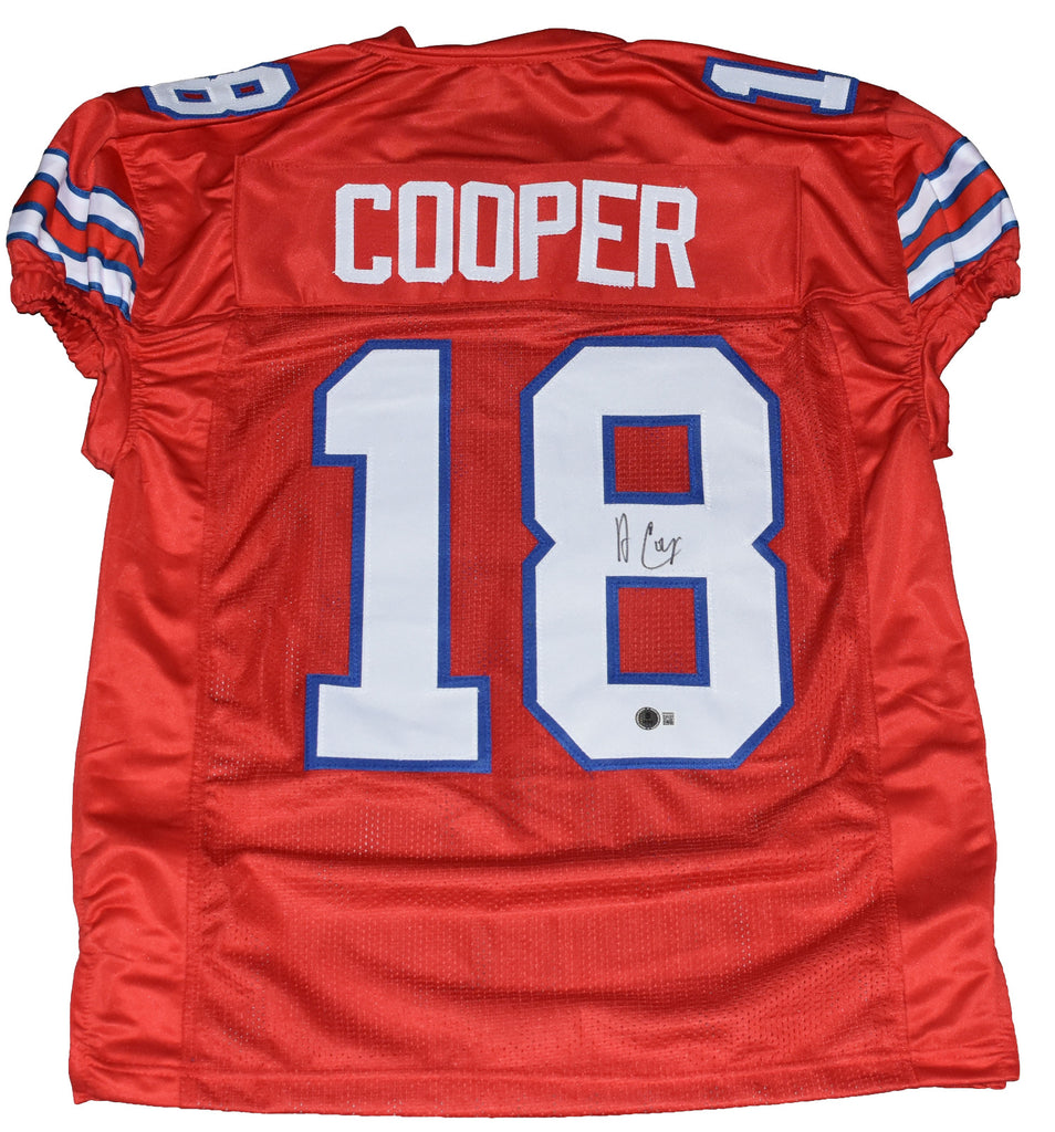 Amari Cooper, star wide receiver for the Buffalo Bills, has hand signed this red custom game cut jersey at a private signing. Jersey is size XL and all letters/numbers are sewn-on. This item is authenticated by Beckett Authentication Services and was signed in the presence of one of their representatives. Their tamper-evident hologram featuring a QR code and serial number is on the item. The authenticity can be verified online by entering the serial number or scanning the QR code.Item pictured may not be the exact item you will receive. It will be similar quality, and we guarantee your satisfaction.