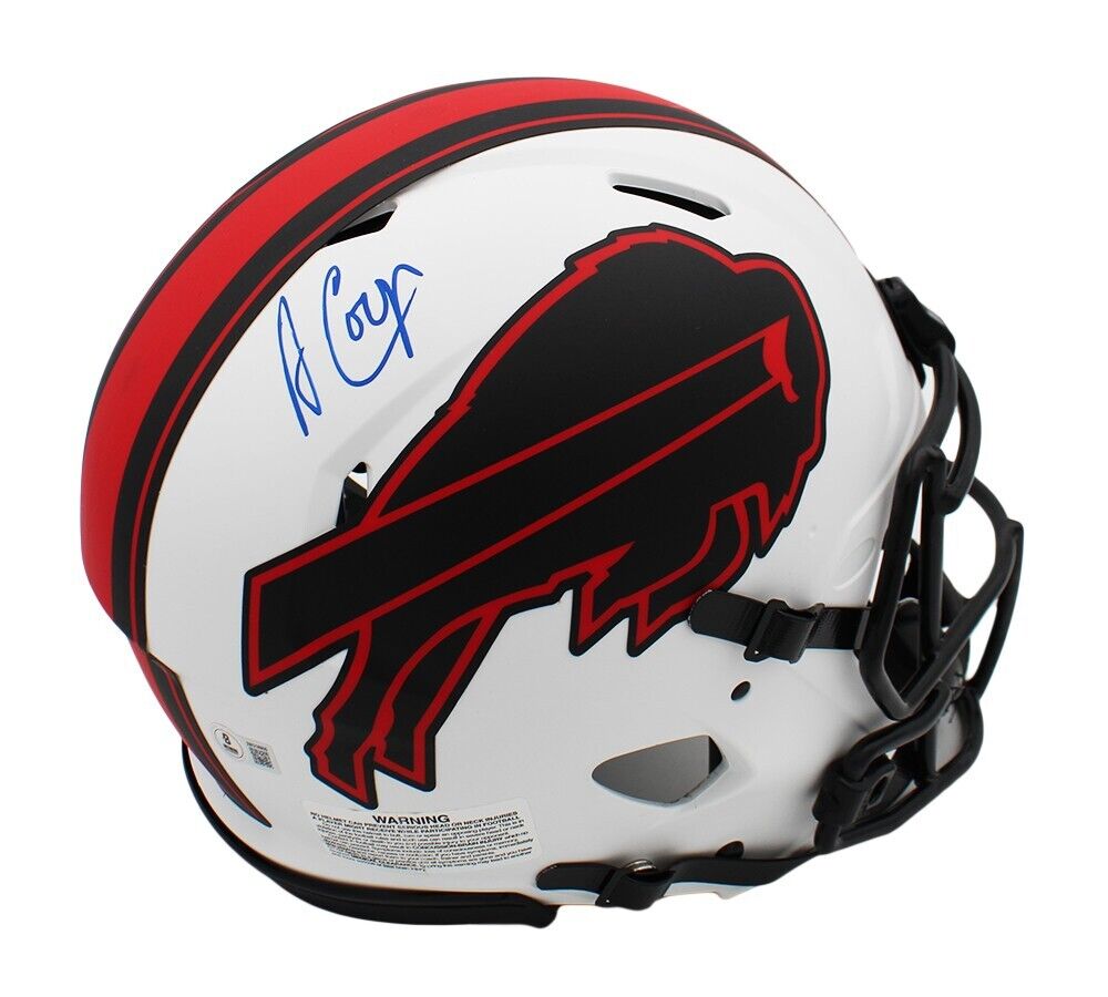 A Buffalo Bills Speed Authentic Lunar NFL Helmet hand signed by Amari Cooper. The item and signature are in excellent condition. Amari is a wide receiver in the NFL. After a successful college career at the University of Alabama, Amari was picked first round 4th overall in the 2015 NFL Draft. He had back to back 1000-yard seasons and is a 5x Pro Bowler. AUTHENTICATION: The item is accompanied by a Beckett Serial Numbered and Databased Hologram