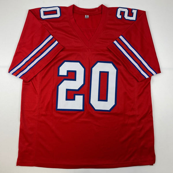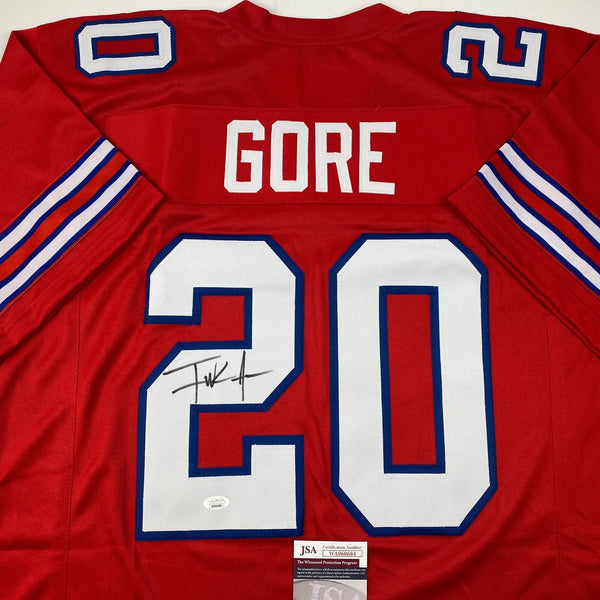 Autographed/Signed Frank Gore Buffalo Red Football Jersey JSA COA Jersey has no brand names or logos. This is a custom jersey and was not manufactured by or in any manner associated with any professional sports league or manufacturer. This custom jersey carries no professional sports league designation. The item is intended to be an autographed collectible. The custom jersey displays the name and number of the player. This item in no way is affiliated with or connected to any professional sports organization. Size is XL.