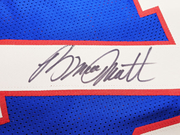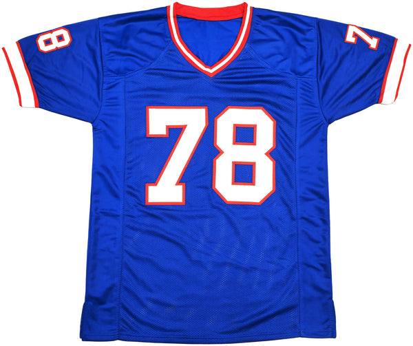 This is a Blue Jersey that has been hand signed by Bruce Smith. This is a custom jersey with no name brand. The approximate size is XL. It has nice sewn in name and numbers. This item has been witnessed and certified authentic by Beckett Authentication (BAS) and comes with their tamper-proof witness sticker.