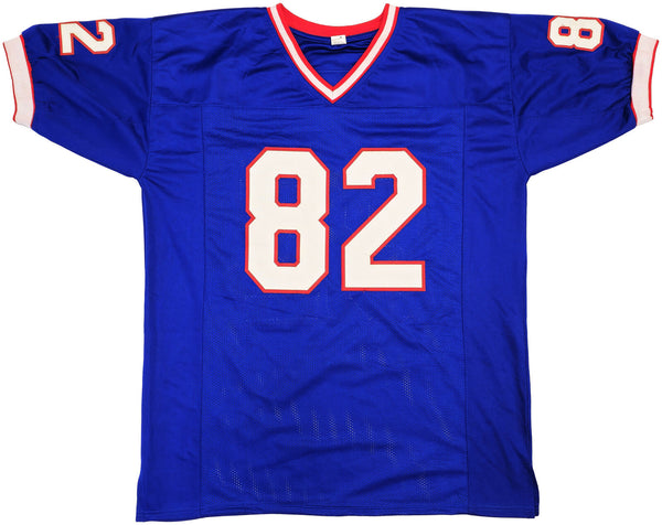 This is a Blue Jersey that has been hand signed by Don Beebe. This is a custom jersey with no name brand. The approximate size is XL. It has nice sewn in name and numbers. This item has been certified authentic by JSA and comes with their tamper-proof hologram and matching certificate of authenticity.