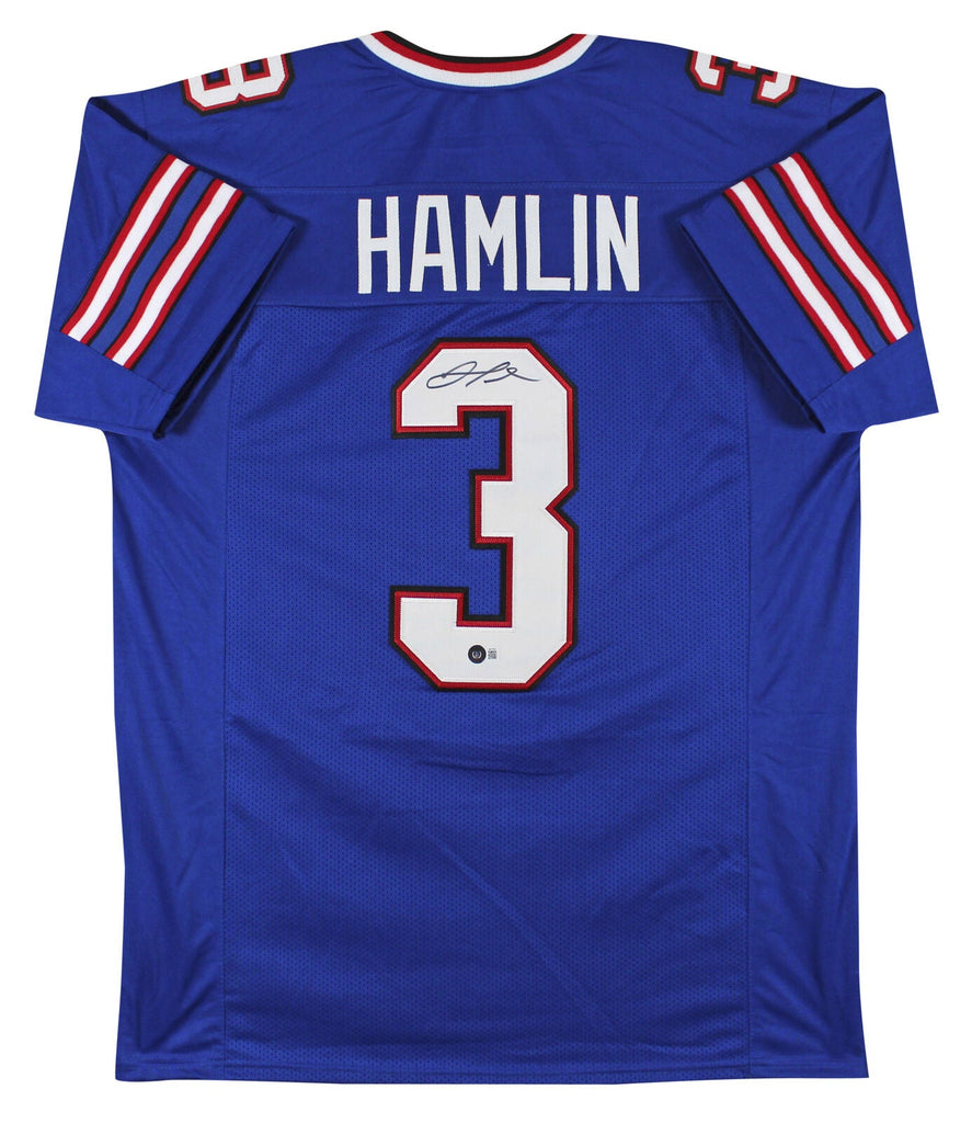 This Autographed Blue Pro Style Jersey has been Personally Signed by Damar Hamlin of the Buffalo Bills. This item is 100% Authentic to include a hologram by Beckett Authentication Services. This item will come with an affixed Beckett Authentication Services (BAS) authentication sticker, which includes a scannable QR code to verify authenticity. Please note that Beckett no longer provides serial-numbered COA cards, and the attached BAS sticker will serve as the complete authentication for this item. This is a BAS Witnessed Protection Program item which means a Beckett Authentication Service representative was present when this item was being signed. We conducted an autograph signing with Damar Hamlin where multiples of the same item were signed. While the photographs are representative of this item, the size, placement and strength of the signature may vary. Each item is hand signed, therefore, each autograph is unique. This item can be verified through BAS Witnessed. This is a X-Large sized, non-branded, custom-stitched Jersey.