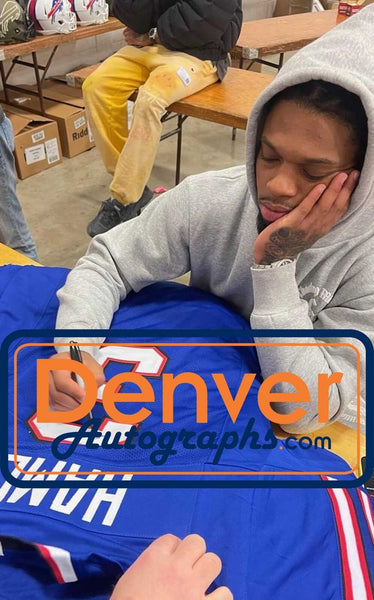 Damar Hamlin Autographed/Signed Pro Style Blue XL Jersey Beckett 39944 The number in the listing title is just an inventory sku for our records and is not the authentication number. The item pictured is a stock photo unless otherwise noted. This is a custom pro style Blue XL jersey with sewn on name and numbers that was personally autographed by Damar Hamlin. Includes a certificate of authenticity from Beckett Authentication Services (BAS) and Denver Autographs.