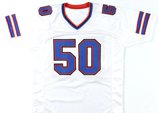 THIS IS NOT AN NFL JERSEY. THIS HAS NO TAGS, NO LOGOS, NO EMBLEMS. This is a hand autograph of Greg Rousseau of the Buffalo Bills on a Custom Made (non-name brand) Authentic Style Jersey with stitched letters and numbers. This item has a Beckett Witnessed Authentication, which comes with a Beckett numbered hologram and a QR Code for verification. You can view this item on the Beckett Authentication website. It was signed either at a public autograph appearance or a private signing. This is a stock photo of the item. Although you may not receive this exact item, the item you receive is virtually identical and brand new in great shape. Jersey size is XL. THIS IS NOT AN NFL JERSEY. THIS HAS NO TAGS, NO LOGOS, NO EMBLEMS. This is a hand autograph of Greg Rousseau of the Buffalo Bills on a Custom Made (non-name brand) Authentic Style Jersey with stitched letters and numbers. This item has a Beckett Witnessed Authentication, which comes with a Beckett numbered hologram and a QR Code for verification. You can view this item on the Beckett Authentication website. It was signed either at a public autograph appearance or a private signing. This is a stock photo of the item. Although you may not receive this exact item, the item you receive is virtually identical and brand new in great shape. Jersey size is XL.