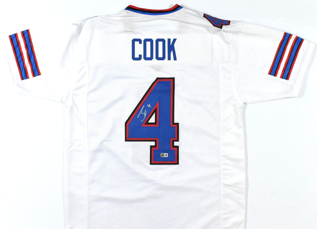 THIS IS NOT AN NFL JERSEY. THIS HAS NO TAGS, NO LOGOS, NO EMBLEMS. This is a hand autograph of James Cook of the Buffalo Bills on a Custom Made (non-name brand) Authentic Style Jersey with stitched letters and numbers. This item has a Beckett Witnessed Authentication, which comes with a Beckett numbered hologram and a QR Code for verification. You can view this item on the Beckett Authentication website. It was signed either at a public autograph appearance or a private signing. This is a stock photo of the item. Although you may not receive this exact item, the item you receive is virtually identical and brand new in great shape. Jersey size is XL. THIS IS NOT AN NFL JERSEY. THIS HAS NO TAGS, NO LOGOS, NO EMBLEMS. This is a hand autograph of James Cook of the Buffalo Bills on a Custom Made (non-name brand) Authentic Style Jersey with stitched letters and numbers. This item has a Beckett Witnessed Authentication, which comes with a Beckett numbered hologram and a QR Code for verification. You can view this item on the Beckett Authentication website. It was signed either at a public autograph appearance or a private signing. This is a stock photo of the item. Although you may not receive this exact item, the item you receive is virtually identical and brand new in great shape. Jersey size is XL.