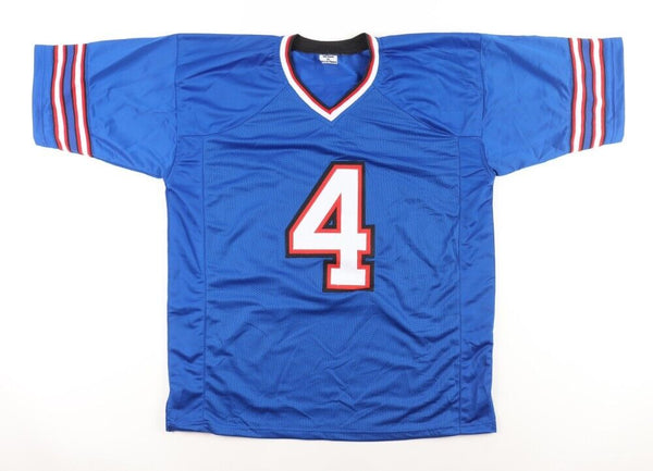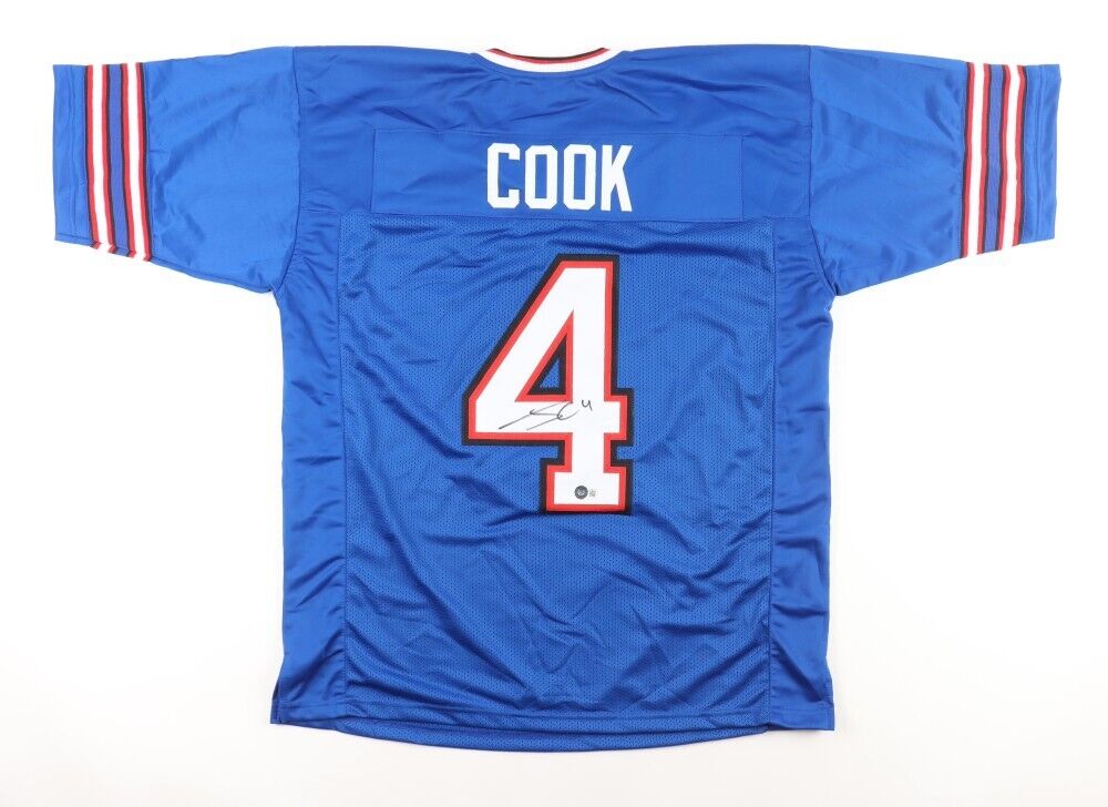Custom on-field style jersey. Everything sewn on, size XL. Hand-signed by James Cook.The lot / autograph(s) includes an official Beckett Authentication Services serially numbered hologram for authenticity purposes. The signing of this item was witnessed by Beckett.Authentication: Beckett HologramCustom on-field style jerseys are a more affordable option for autograph seekers. These jerseys do not have any brand name or tags and are made in the Philippines. They feature stitched on names and numbers and are made to look very similar to the on-field jerseys that the players wear. These custom jerseys are very commonly used in the memorabilia industry.
