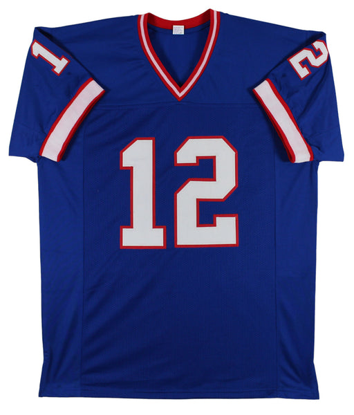 This Autographed Blue Pro Style Jersey has been Personally Signed by Jim Kelly of the Buffalo Bills. This item is 100% Authentic to include a Certificate of Authenticity (COA) / hologram by Beckett Authentication Services. The authenticity can be verified on Beckett Authentication Services website. This is a X-Large sized, non-branded, custom-stitched Jersey.