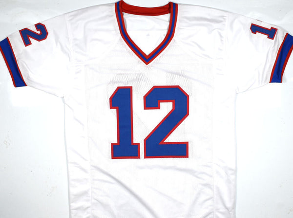 Jim Kelly Autographed White Pro Style Jersey-Beckett W Hologram *Silver *1 THIS IS NOT AN NFL JERSEY. THIS HAS NO TAGS, NO LOGOS, NO EMBLEMS. This is a Hand Autograph of Jim Kelly on a custom made (Non Name Brand) authentic style jersey with stitched letters and numbers. This item has a Beckett Witness Authentication, which comes with a Beckett #'ed hologram and a QR code for verification. You can view this item on the Beckett website and it shows when and where the item was signed. It was signed either at a public autograph appearance or a private signing. This is a stock photo of the item. Although you may not receive this exact item, the item you receive is virtually identical and brand new in great shape. Jersey size is XL.