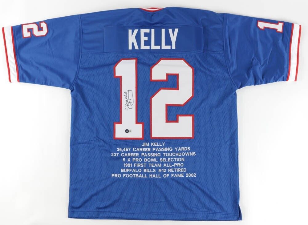 Jim Kelly Signed Buffalo Bill Career Highlight Stat Jersey (Beckett) HOF 2002 QB