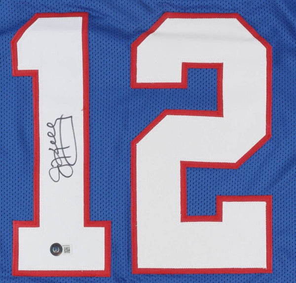 Custom on-field style jersey. Everything is sewn on, size XL. Hand-signed by Jim Kelly (HOF). Kelly's career highlights have been custom stitched onto the back of the jersey below the reverse numbers.The lot / autograph(s) includes an official Beckett Authentication Services serially-numbered hologram for authenticity purposes. The signing of this item was witnessed by Beckett.Authentication: Beckett Hologram