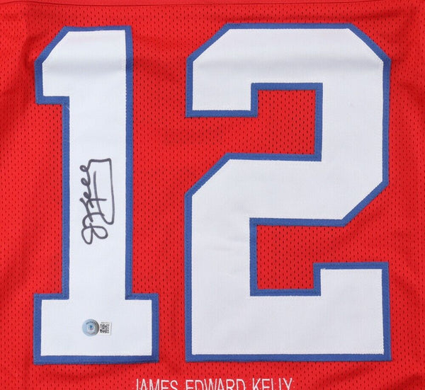 Custom on-field style jersey. Everything is sewn on, size XL. Hand-signed by Jim Kelly (HOF). Kelly's career highlights have been custom stitched onto the back of the jersey below the reverse numbers.The lot / autograph(s) includes an official Beckett Authentication Services serially-numbered hologram for authenticity purposes. The signing of this item was witnessed by Beckett.Authentication: Beckett Hologram