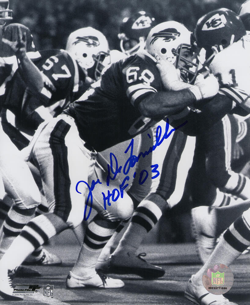 Joe Delamieulleure signed Buffalo Bills black and white vs Chiefs 8x10 photo with 'HOF 03' inscription. Item comes with a Schwartz Sports Memorabilia tamper-proof numbered hologram and Certificate of Authenticity which can be verified online.