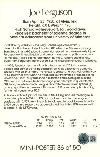 The number in the listing title is just an inventory sku for our records and is not the authentication number. This is the exact item that you will receive so please see pictures for condition. This is a mini poster measuring 8.5" x 5.5" that was personally autographed by Joe Ferguson with Buffalo Bills inscription. Includes a certificate of authenticity from Beckett Authentication Services (BAS) and Denver Autographs.