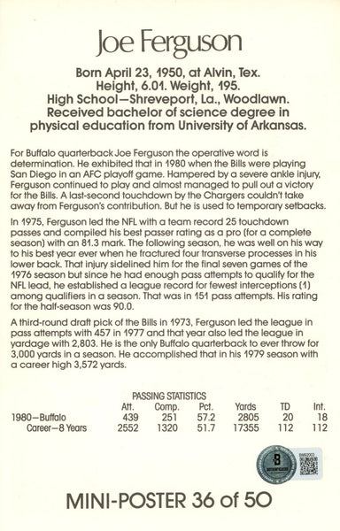 The number in the listing title is just an inventory sku for our records and is not the authentication number. This is the exact item that you will receive so please see pictures for condition. This is a mini poster measuring 8.5" x 5.5" that was personally autographed by Joe Ferguson with Bills inscription. Includes a certificate of authenticity from Beckett Authentication Services (BAS) and Denver Autographs.FREE SHIPPING within the USA on orders over $10!