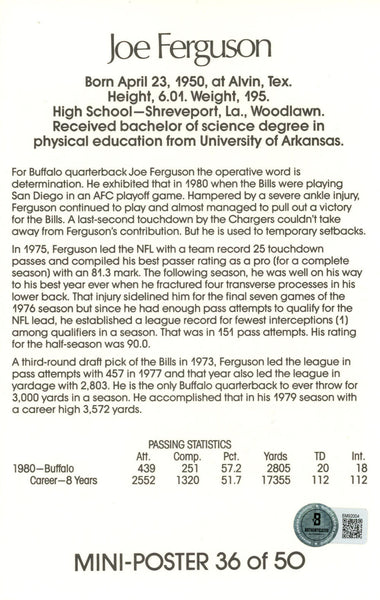 The number in the listing title is just an inventory sku for our records and is not the authentication number. This is the exact item that you will receive so please see pictures for condition. This is a mini poster measuring 8.5" x 5.5" that was personally autographed by Joe Ferguson. Includes a certificate of authenticity from Beckett Authentication Services (BAS) and Denver Autographs.FREE SHIPPING within the USA on orders over $10!