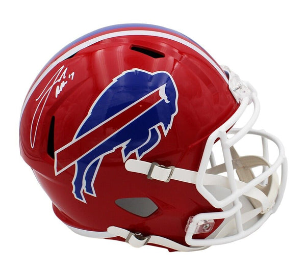 A Buffalo Bills Speed Replica Throwback Red 87-01 NFL Helmet hand signed by Josh Allen. The item and signature are in excellent condition. Josh was drafted by the Bills in the first round of the 2018 NFL Draft and is a 2x Pro Bowler. AUTHENTICATION: The item is accompanied by an Beckett Serial Numbered and Databased Hologram.