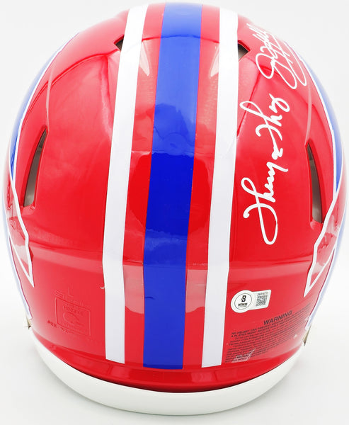 This is a Buffalo Bills Team Greats Red 1987-01 Throwback Full Size Speed Authentic Helmet that has been hand signed by Jim Kelly, Thurman Thomas & Andre Reed. This item has been witnessed and certified authentic by Beckett Authentication (BAS) and comes with their tamper-proof witness hologram.