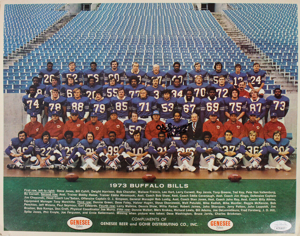 O.J. Simpson Autographed/Signed Buffalo Bills 11x17 Roster Photo HOF JSA 36661 The number in the listing title is just an inventory sku for our records and is not the authentication number. The item pictured is a stock photo unless otherwise noted. This is a 11x17 roster photo that was personally autographed by OJ Simpson with HOF inscription. Includes a certificate of authenticity from James Spence Authentication (JSA) and Denver Autographs.
