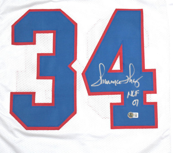 Thurman Thomas Autographed White Pro Style Jersey w/HOF - Beckett W Hologram *Silver THIS IS NOT AN NFL JERSEY. THIS HAS NO TAGS, NO LOGOS, NO EMBLEMS. This is a hand autographed Jersey of Thurman Thomas. This is Custom Made (Non Name Brand) Authentic Style (Stitched Letters and Numbers) Jersey. This item has a Beckett Witnessed Authentication, which comes with a Beckett numbered hologram and a QR code for verification. You can view this item on the Beckett Authentication website and it shows when and where the item was signed. It was signed either at a public autograph appearance or a private signing. This is a stock photo of the item. Although you may not receive this exact item, the item you receive is virtually identical and brand new in great shape. Jersey size is XL.