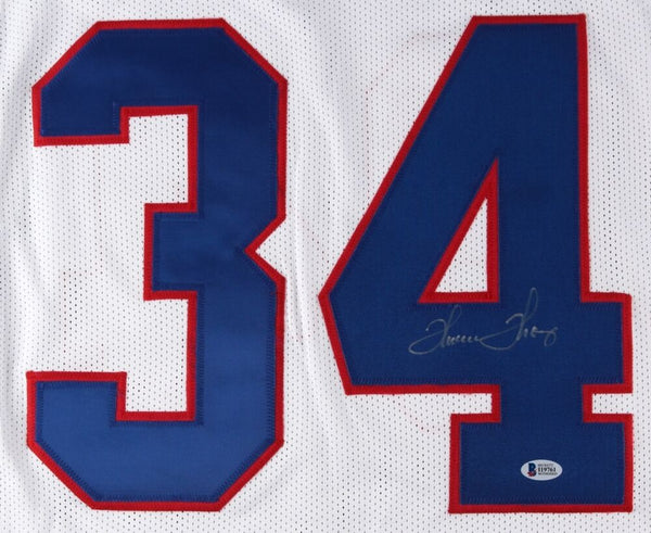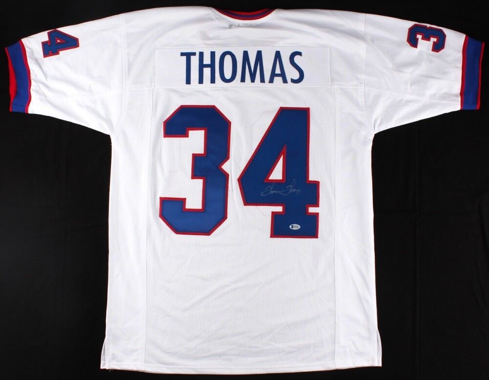 Custom on-field style jersey. Everything is sewn on, size XL. Hand-signed in silver paint pen by Thurman Thomas (Bill, HOF, Dolphins). The lot / autograph(s) includes an official Beckett Authentication Services serially-numbered hologram and matching COA for authenticity purposes. The signing of this item was witnessed by Beckett.Authentication: Beckett COA
