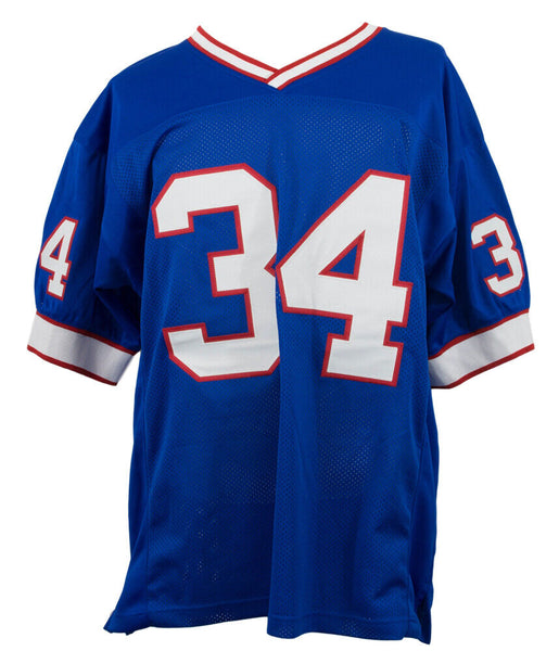Custom on-field style jersey. Everything is sewn on, size XL. Hand-signed in black felt-tip pen by Thurman Thomas (HOF,Buffalo Bills, Miami Dolphins). The lot / autograph(s) includes an official James Spence Authentication (JSA) hologram and matching COA for authenticity purposes. The signing of this item was witnessed by JSA.Authentication: JSA COA
