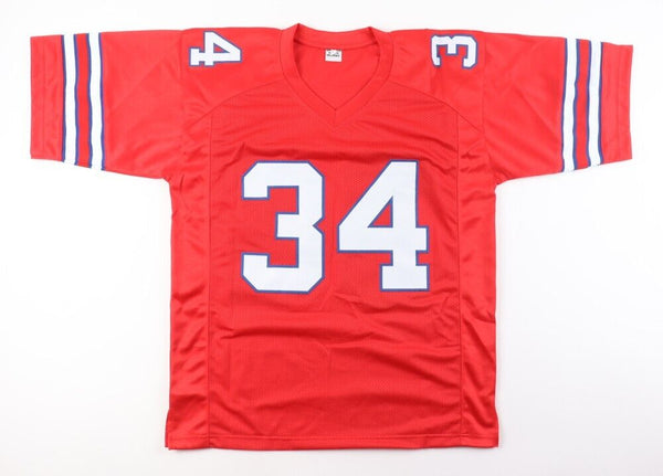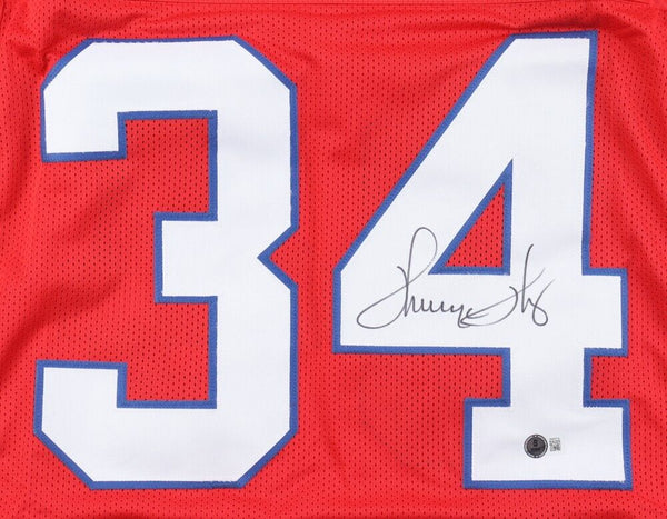 Custom on-field style jersey. Everything is sewn on, size XL. Hand-signed in black Sharpie pen by Thurman Thomas (HOF, Buffalo Bills, Miami Dolphins). The autograph includes an official Beckett Authentication Services serially numbered hologram and QR Code Card for authenticity purposes. The signing of this item was witnessed by Beckett.Authentication: Beckett Hologram with QR Code Card