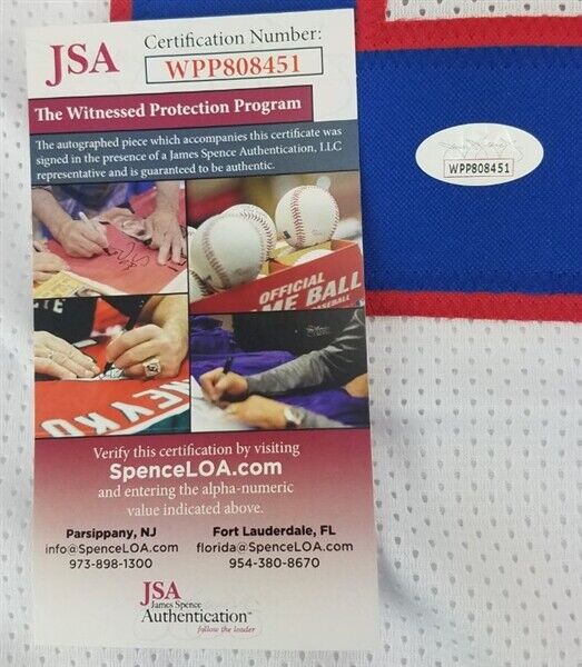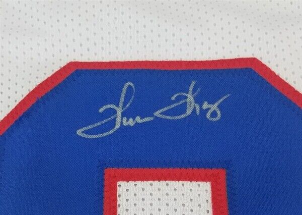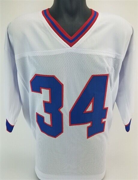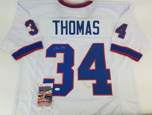 Custom on-field style jersey. Everything is sewn on, size XL. Hand-signed in silver paint pen by Thurman Thomas (HOF, Dolphins). The lot / autograph(s) includes an official James Spence Authentication (JSA) hologram and matching COA for authenticity purposes. The signing of this item was witnessed by JSA.Authentication: JSA COA