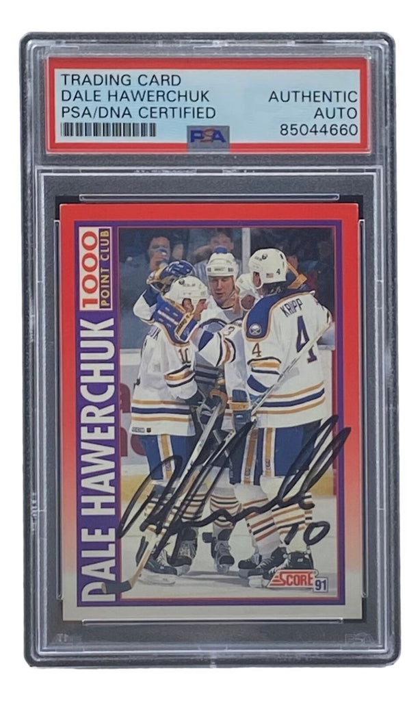 Featured is a Dale Hawerchuk signed 1991 Score #266 Buffalo Sabres trading card. This card has been hand signed by Hawerchuk and has been authenticated and encapsulated by PSA. This card would make a great addition to any sports memorabilia collection!. SPECIFICATIONS Autographed By: Dale Hawerchuk Team: Sport: Hockey Authentication: Professional Sports Authenticator (PSA)