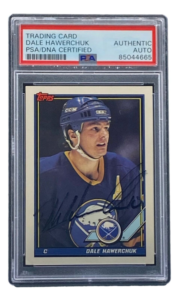 Featured is a Dale Hawerchuk signed 1991 Topps #65 Buffalo Sabres trading card. This card has been hand signed by Hawerchuk and has been authenticated and encapsulated by PSA. This card would make a great addition to any sports memorabilia collection! SPECIFICATIONS Autographed By: Dale Hawerchuk Team: Sport: Hockey Authentication: Professional Sports Authenticator (PSA)