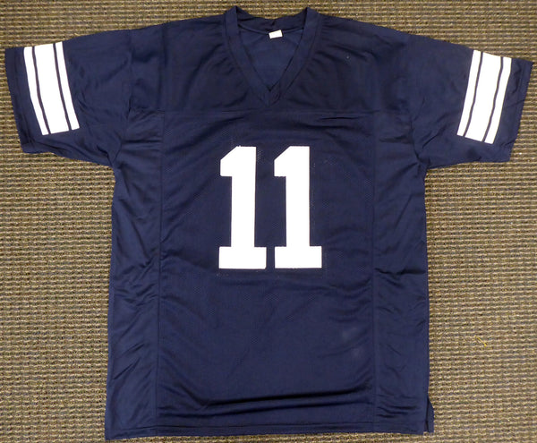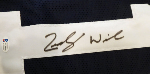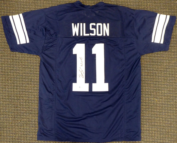 This is a Blue Jersey that has been hand signed by Zach Wilson. This is a custom jersey with no name brand. The approximate size is XL. It has nice sewn in name and numbers. This item has been certified authentic by Beckett Authentication (BAS) and comes with their tamper-proof sticker and matching certificate of authenticity.