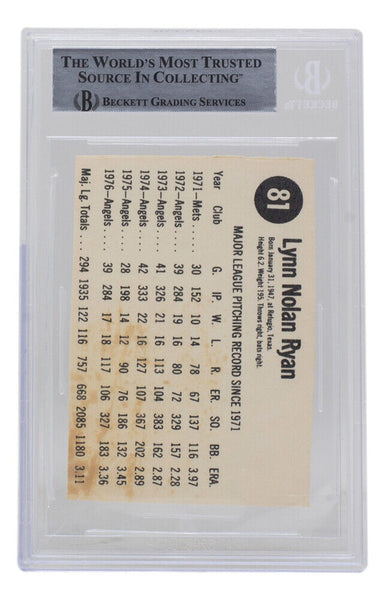 Featured is a Nolan Ryan signed 1977 Hostess Californias Angels baseball card #81. This card was hand signed by Nolan Ryan and has been slabbed and authenticated by Beckett authentication services. This item would make a great addition to any sports memorabilia collection. SPECIFICATIONS Autographed By: Nolan Ryan Team: California Angels Sport: Baseball Authentication: Beckett Grading Services