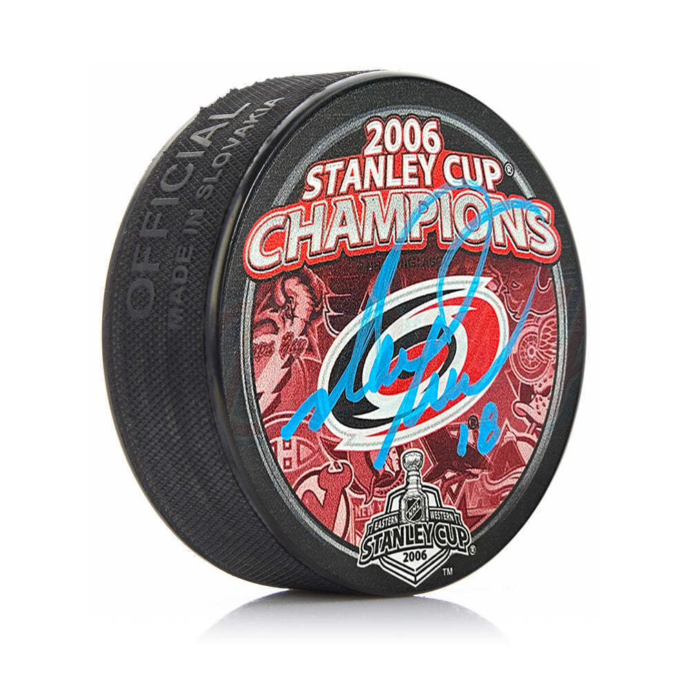 Mark Recchi Carolina Hurricanes 2006 Stanley Cup Champions Autographed Hockey Logo Puck Official NHL logo puck with signature from Hurricanes great Mark Recchi - authenticated by Dynasty Sports This officially licensed logo puck has been hand-signed by Carolina Hurricanes legend Mark Recchi. It has been authenticated by Dynasty Sports during a public autograph signing on January 28, 2024. Hand-Signed by Carolina Hurricanes great Mark Recchi Signature is bold and clear on the puck Authenticated with Dynasty Sports serially numbered hologram during public autograph event Official NHL puck Custom framing options available - contact our storefront for information regarding customizing this in the frame and matting colors of your choice! Add a nameplate and team logo medallions! Please allow additional time for framing and shipping.