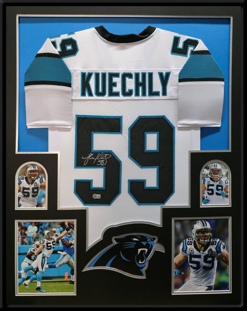 Custom Framed Luke Kuechly hand signed Carolina Panthers style custom jersey.Beckett HologramThe jersey has fully stitched numbers on the front and back, no logos or tags. It is a great item and a must for all great sports fans!Stock photos are used for auctions. Will receive equal quality.This item is professionally framed, it measures 32"x40" inside , 42"x34" outside , using UV protective Acrylic glass for safe keeping and safe transport, team color matting, black moulding and hanging hooks on the back. All additional items in frame seen in pictures included. 100% ready to hang in your fan cave.