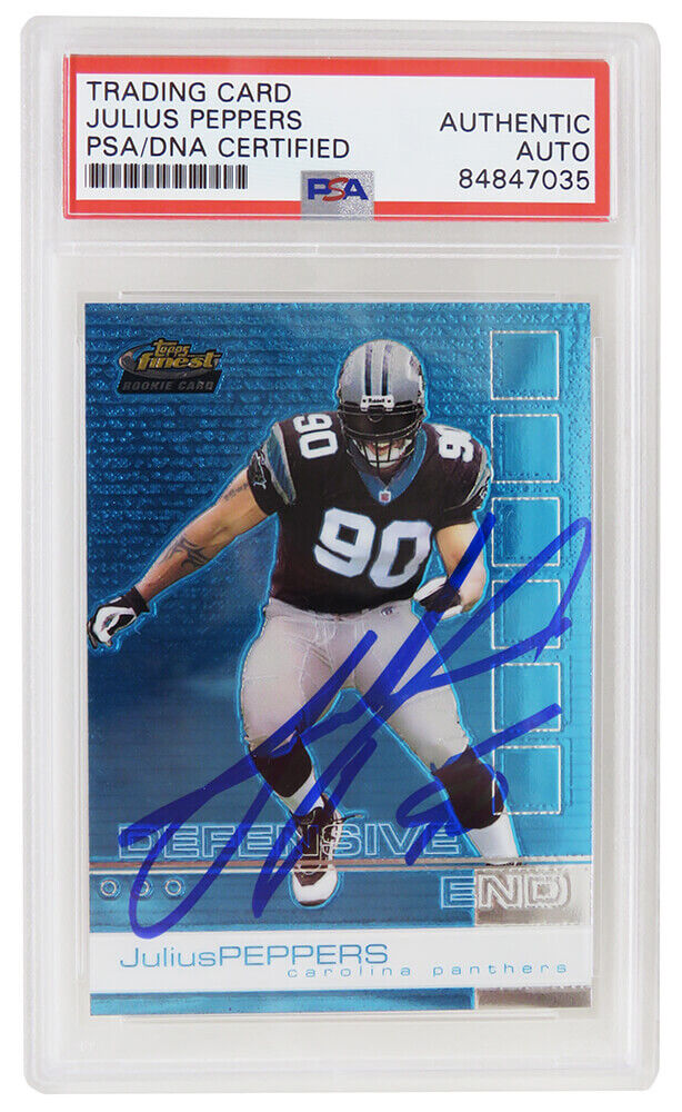 Julius Peppers signed Carolina Panthers 2002 Topps Finest football rookie card #77. The card has been authenticated and encapsulated by PSA/DNA and the number can be verified online. The image of the item is a stock photo, as we may have multiples of the item in stock. The Slabbed Card you will receive will be of the card described. (Same grade, Same authentication) You may or may not receive the exact PSA serial number on the slab label shown in image.