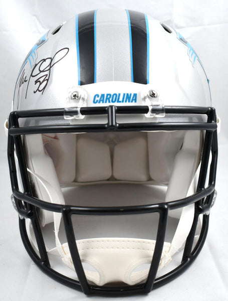 This is a Luke Kuechly of the Carolina Panthers Autographed Riddell football full size Speed Authentic helmet. This item has a Beckett Witnessed Authentication, which comes with a numbered sticker hologram and a QR code for verification. You can view this item on the Beckett Authentication website and it shows when and where the item was signed. It was signed either at a public autograph appearance or a private signing. This is a stock photo of the item. Although you may not receive this exact item, the item you receive is virtually identical, brand new, and in great shape. *Autograph location may vary* This is a Luke Kuechly of the Carolina Panthers Autographed Riddell football full size Speed Authentic helmet. This item has a Beckett Witnessed Authentication, which comes with a numbered sticker hologram and a QR code for verification. You can view this item on the Beckett Authentication website and it shows when and where the item was signed. It was signed either at a public autograph appearance or a private signing. This is a stock photo of the item. Although you may not receive this exact item, the item you receive is virtually identical, brand new, and in great shape. *Autograph location may vary*