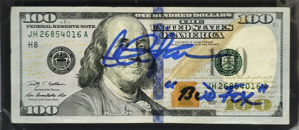This is a $100 Bill that has been hand signed by Charlie Sheen. The condition of the signature was graded a Gem Mint 10 by PSA/DNA. This item was inscribed "Bud Fox". It has been certified authentic by PSA/DNA and comes encapsulated in their tamper-proof holder.