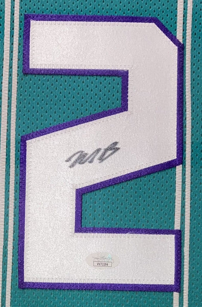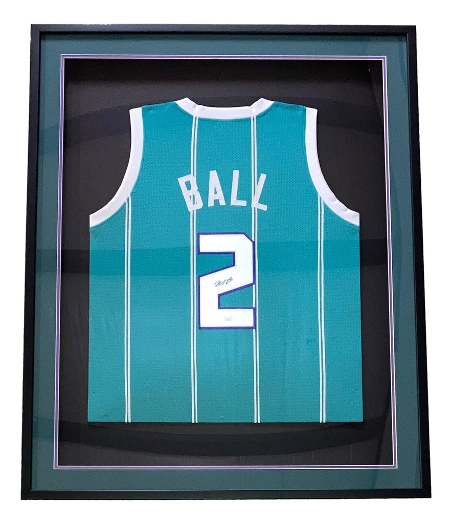 Featured is a Lamelo Ball signed custom blue basketball jersey. This jersey was hand signed by Lamelo Ball and has been authenticated by JSA authentication services. Included with the jersey is a JSA hologram and certificate of authentication. This jersey has been professionally framed and mounted and is approximately 34x42. This jersey has sewn letters and numbers and has NO logos or any affiliation with any manufacturer, team, or league. It is simply intended to be used as an autographed collectible. SPECIFICATIONS Autographed By: Lamelo Ball Team: Charlotte Hornets Sport: Basketball Authentication: James Spence Authentication (JSA)