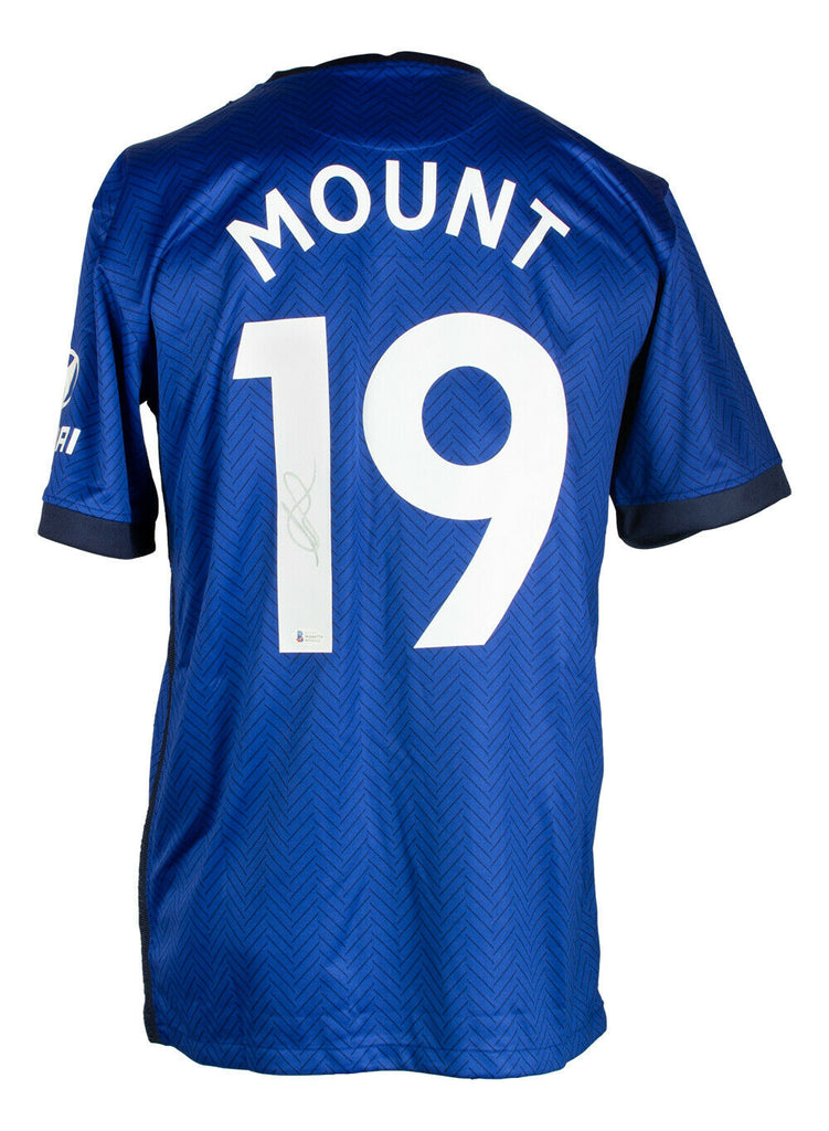 Featured is a Mason Mount signed in silver, blue Chelsea FC soccer jersey. This jersey was signed by Mason Mount in the presence of a Beckett authentication representative. Included with the jersey is a Beckett witnessed hologram and certificate of authentication. This item would make a great addition to any sports memorabilia collection!. SPECIFICATIONS Autographed By: Mason Mount Team: Chelsea Sport: Soccer Authentication: Becket Grading Services