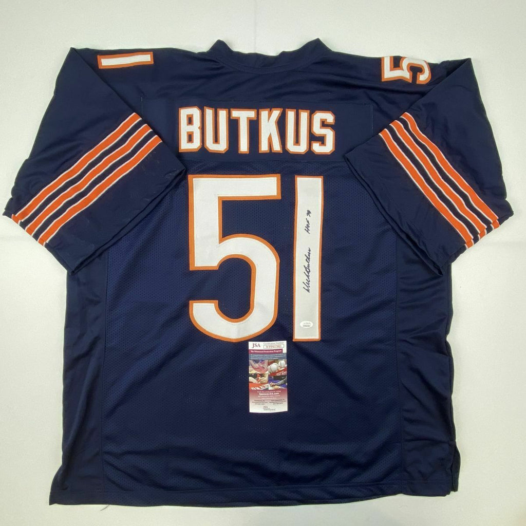 Autographed/Signed DICK BUTKUS HOF 79 Chicago Blue Football Jersey JSA COA Auto This is a custom jersey and was not manufactured by or in any manner associated with any professional sports league or manufacturer. This custom jersey carries no professional sports league designation. The item is intended to be an autographed collectible. Reference of team in the title is to allow the purchaser a point of association. The custom jersey displays the name, number and authenticated signature of the player. This item in no way is affiliated with or connected to any professional sports organization. The autograph, as always is guaranteed to be authentic and has been certified as authentic by a third-party, trusted authenticator. Size is XL unless otherwise noted.