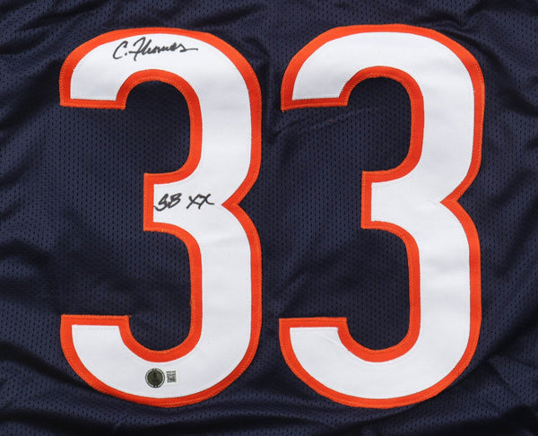 Custom on-field style jersey. Everything is sewn on, size XL. Hand-signed in black Sharpie pen by Calvin Thomas. The lot / autograph(s) includes official Beckett Authentication Services serially numbered hologram and QR Code Card for authenticity purposes. The signing of this item was witnessed by Beckett.Authentication: Beckett Hologram with QR Code Card